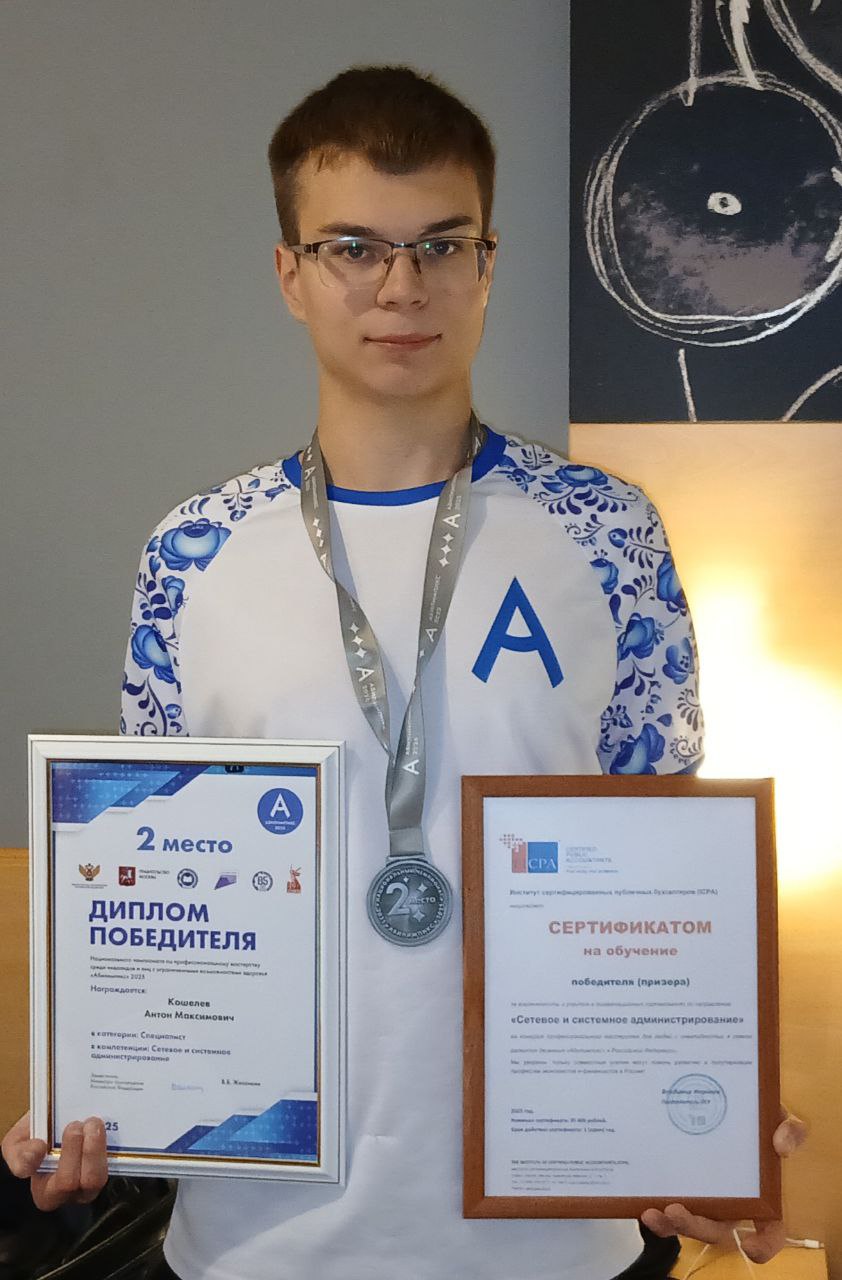 Невероятный успех! Антон Кошелев - серебряный призер Национального чемпионата "Абилимпикс-2025"! 1 ноября стало днем триумфа для Чеховского техникума! На Национальном чемпионате профессионального мастерства "Абилимпикс" в Москве наш студент Кошелев Антон, в категории "Специалисты" по компетенции "Сетевое и системное администрирование", завоевал почетное 2 место! Антон продемонстрировал высочайший уровень знаний и навыков, успешно выполнив все конкурсные задания и обойдя сильных соперников! Мы гордимся его упорством, талантом и целеустремленностью! Параллельно наш студент Ражик Пугачев продолжает борьбу в компетенции "Сварочные технологии"! Желаем ему удачи и верим в его успех!