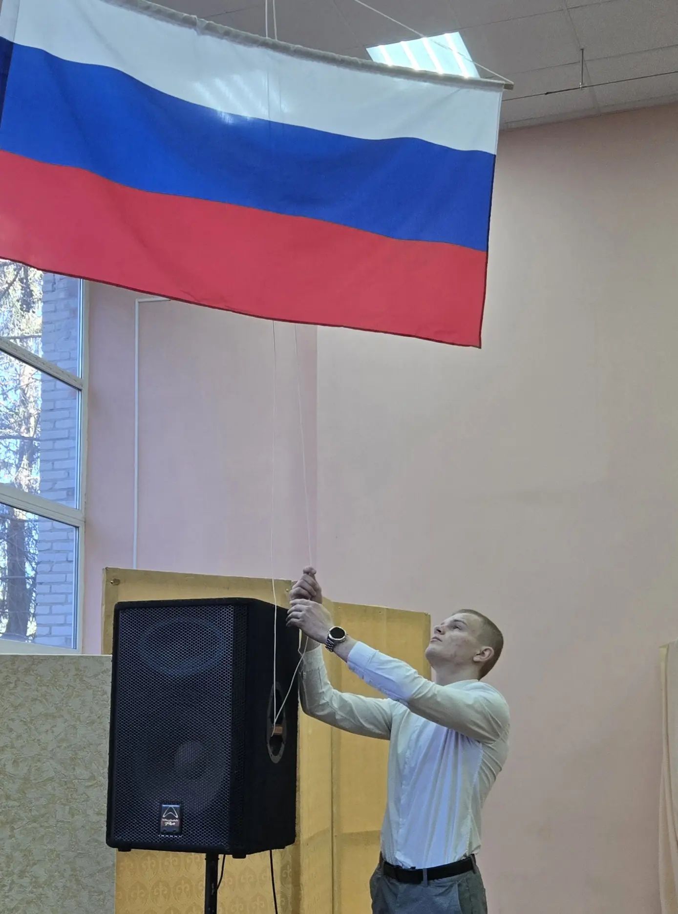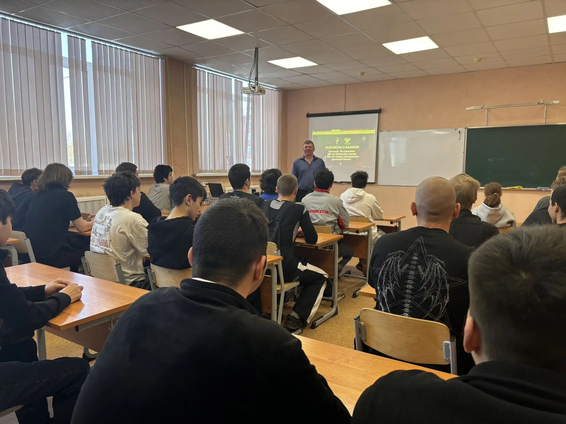 Утро началось с торжественной линейки: под звуки гимна был поднят флаг Российской Федерации. После церемонии в рамках «Разговоров о важном» прошло внеурочное занятие на тему «Большой. За кулисами», приуроченное к двум значимым юбилеям: