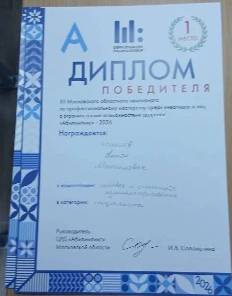 23 апреля 2026 года в Красногорске состоялся XII Московский областной чемпионат по профессиональному мастерству "АБИЛИМПИКС-2026" в котором Победителем стал представитель структурного подразделения-2 ГБПОУ МО "Чеховский техникум" Антон Кошелев (наставник Балабаев М.В.) в компетенции «Сетевое и системное администрирование» в категории - специалисты. Множество представителей техникумов и колледжей со всей области продемонстрировали свои навыки в настройке, обслуживании и защите компьютерных сетей. В напряжённой борьбе за звание лучшего первое место занял Антон Кошелев! Он показал высокий уровень знаний, отличную практическую подготовку и умение быстро находить решения в нестандартных ситуациях. Поздравляем победителя и его наставника с блестящим результатом! Эта победа — ещё одно подтверждение уровня качества подготовки наших специалистов. Мы гордимся Антоном и желаем ему новых профессиональных побед!