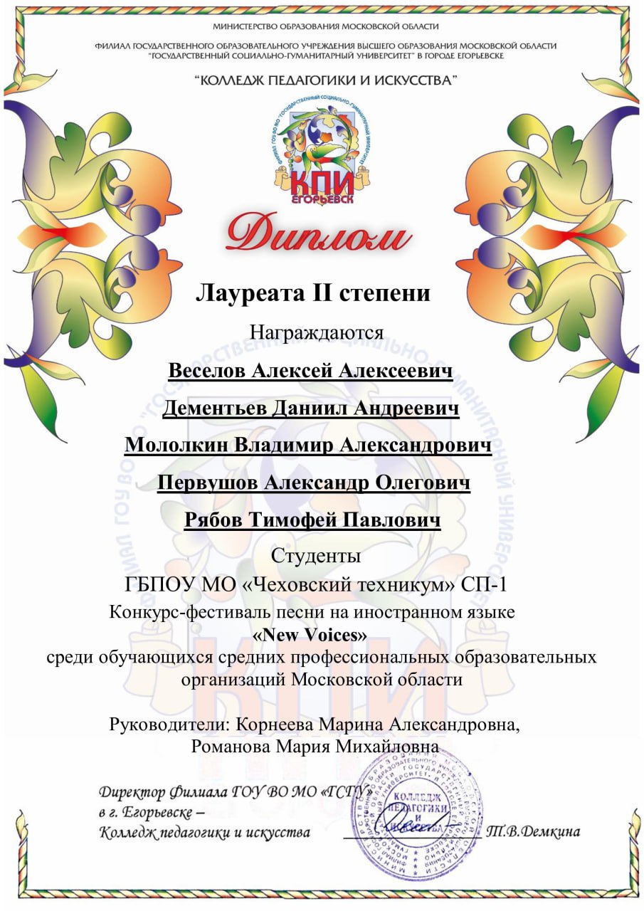 Творческий коллектив из числа обучающихся 1-2 курсов структурного подразделения-1 техникума принял участие в региональном конкурсе-фестивале песни на иностранном языке «New voices», организованном ГОУ ВО МО «Государственный социально-гуманитарный университет». Студенты исполнили песню на английском языке «Солнечный круг» в авторском исполнении и стали Лауреатами II степени. Поздравляем ребят и их наставников Романову М.М., Корнееву М.А. и Савченко О.А.